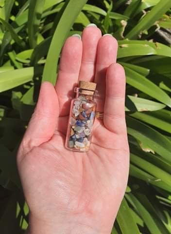 Small glass bottles filled with various crystals.