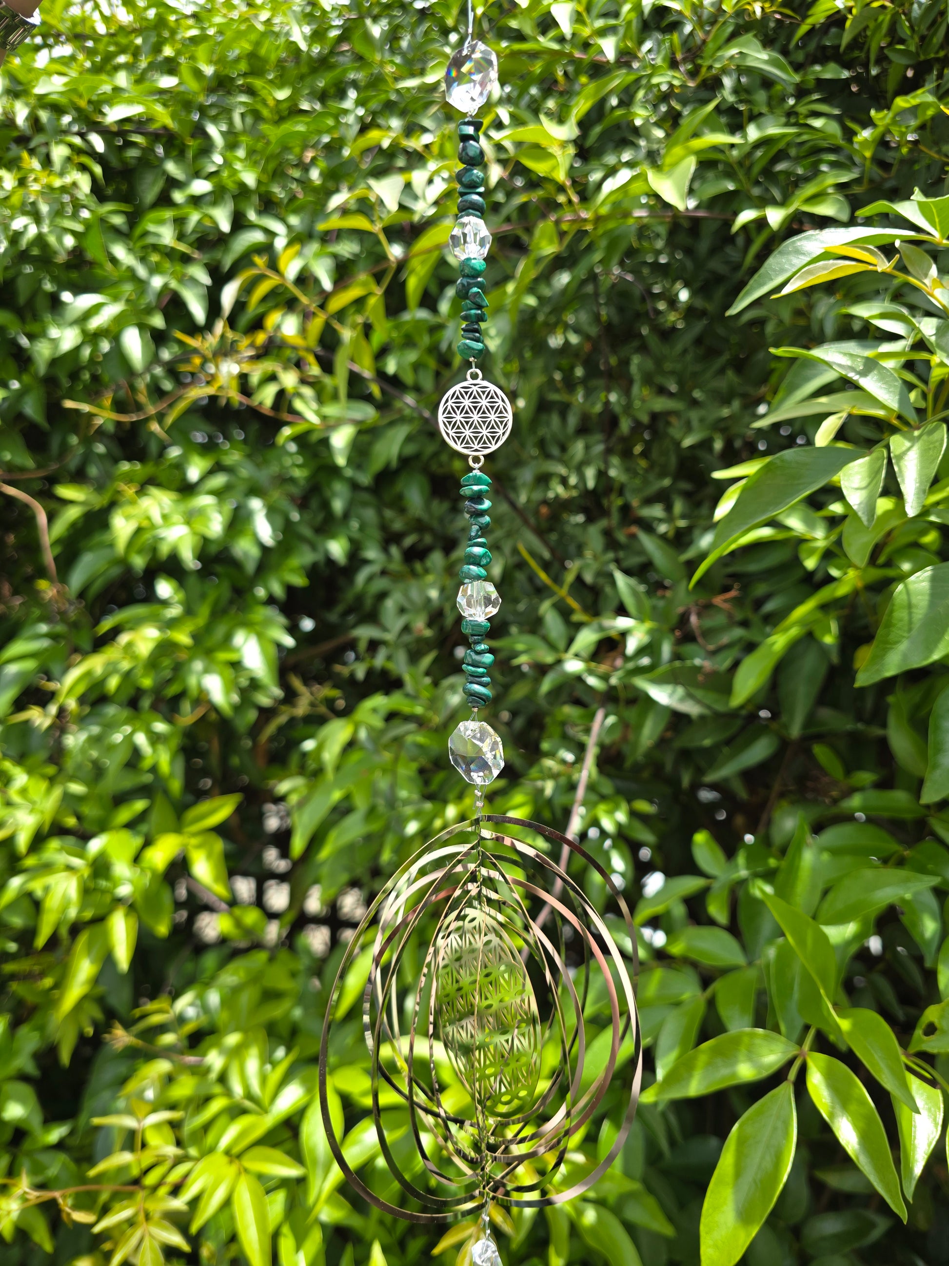 Point Shaped Prism with Crystal Beads & Round Metal Flower Of Life Spinner