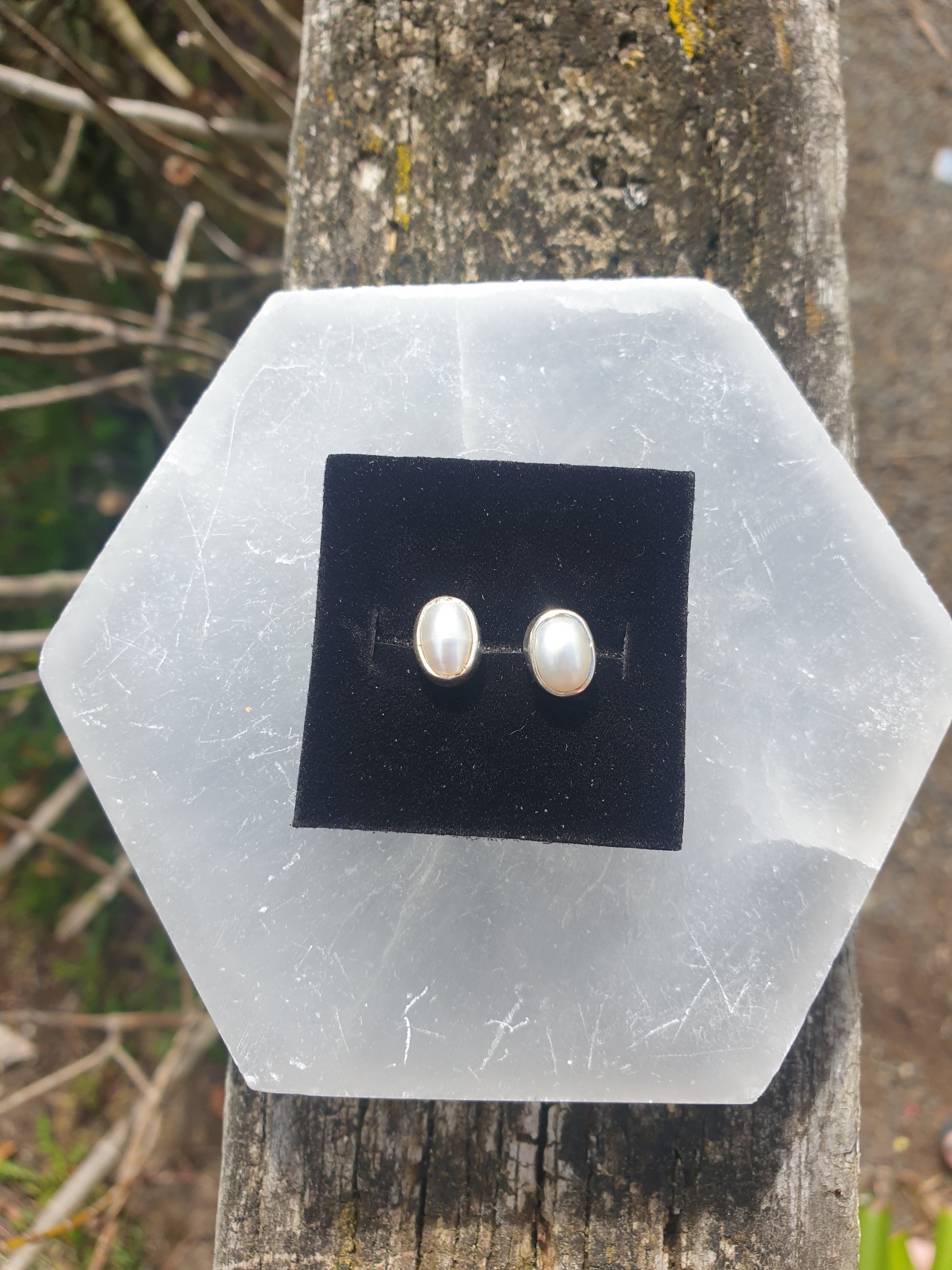 Pearl | Polished Sterling Silver Stud Earrings Oval 8 mm